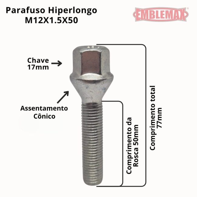 PARAFUSO DE RODA CROM. MULTI HIPERLONGO M12X1.5X50 (5 PCS)